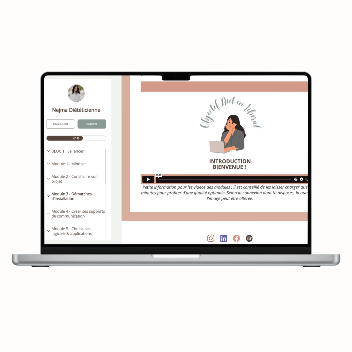 Tu ouvres ton cabinet avec une vraie méthodologie, tu sais exactement comment t’installer, quelles démarches accomplir, comment fixer tes tarifs, comment construire ta communication et gérer ta présence en ligne, comment gérer ton quotidien de diet en libéral...