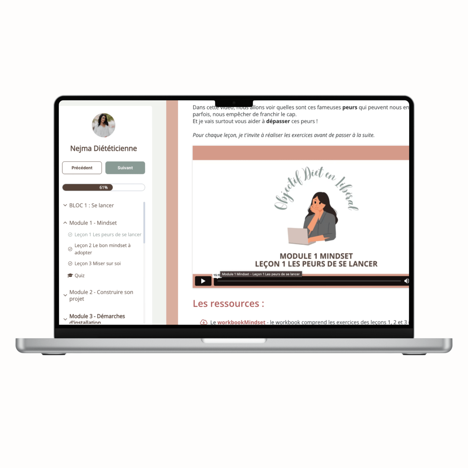 Objectif Diet en Libéral en plus d'un module d'introduction, de bienvenue et de clap de fin.
